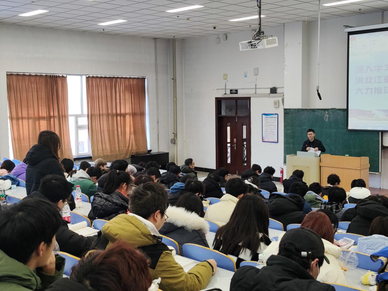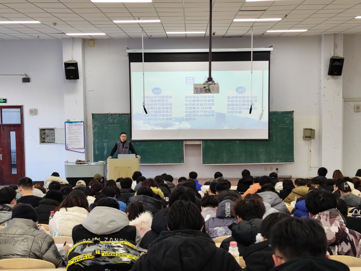 林强以《深入学习习近平总书记视察黑龙江重要讲话重要指示精神,大力推动新时代东北全面振兴》为主题,以习近平总书记到黑龙江省视察并主持召开新时代推进东北全面振兴座谈会为切入点,围绕习近平总书记对黑龙江的重要讲话重要指示精神进行深入解读。林强向同学们概要介绍了省委、公司党委一系列学习贯彻落实举措,并用大量数据和实例说明黑龙江在区位、资源、人才等方面具有雄厚发展优势,黑龙江在高质量发展、可持续振兴中一定大有可为、必将大有作为。林强希望给排水专业的同学们一定要深学细悟笃行习近平总书记重要讲话重要指示精神,坚定专业自信,树立专业理想,打牢专业基础,时刻做好准备为未来智慧城市建设贡献黑大建工人的智慧和力量。