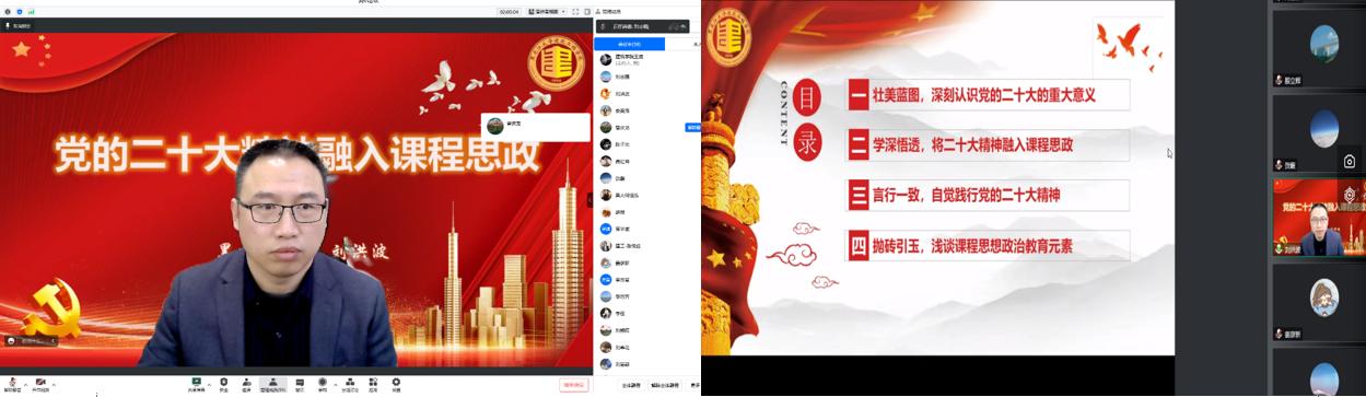 2023年1月7日,经理兼党总支副书记刘洪波以“党的二十大精神融入课程思政”为主题,通过腾讯会议线上开展党的二十大精神理论宣讲活动,公司全体教职工参会。本次宣讲共分为“壮美蓝图,深刻认识党的二十大的重大意义”、“学深悟透,将二十大精神融入课程思政”、“言行一致,自觉践行党的二十大精神”、“抛砖引玉,浅谈课程思想政治教育元素”四个部分。他讲到,习近平总书记在党的二十大报告中对全面建成社会主义现代化强国两步走战略安排进行宏观展望,重点部署未来五年的战略任务和重大举措,展现了一幅令人向往、催人奋进的壮美蓝图。其中,报告在城市规划、城市更新、乡村振兴、生态环境保护、绿色低碳发展、智慧城市、韧性城市、水生态治理等方面的重要论述与公司学科、专业紧密相关,全院教职工要认真学习,深入研究。他强调,大家要充分认识到党的二十大精神融入课程思政的重要性,要读原文悟原理,原原本本学习党的二十大报告,坚持全面准确,做到学深悟透。要坚持结合人才培养实际全面系统学,结合公司学科领域和所涉及的国家重大工程实际需求去学。最后,分别从价值引领、道德培育、四个自信、家国情怀、精神塑造、安全意识和环保意识等七个维度,将党的二十大精神融合专业特点及具体案例,为与会教师带来了一场深刻而精彩的课程思政现场教学。会后,大家纷纷表示将以党的二十大精神为引领,深入学习贯彻习近平新时代中国特色社会主义思想,把课程思政向纵深推进,引领广大青年坚定理想信念、树立正确人生目标,为实现中华民族伟大复兴的中国梦不懈奋斗。