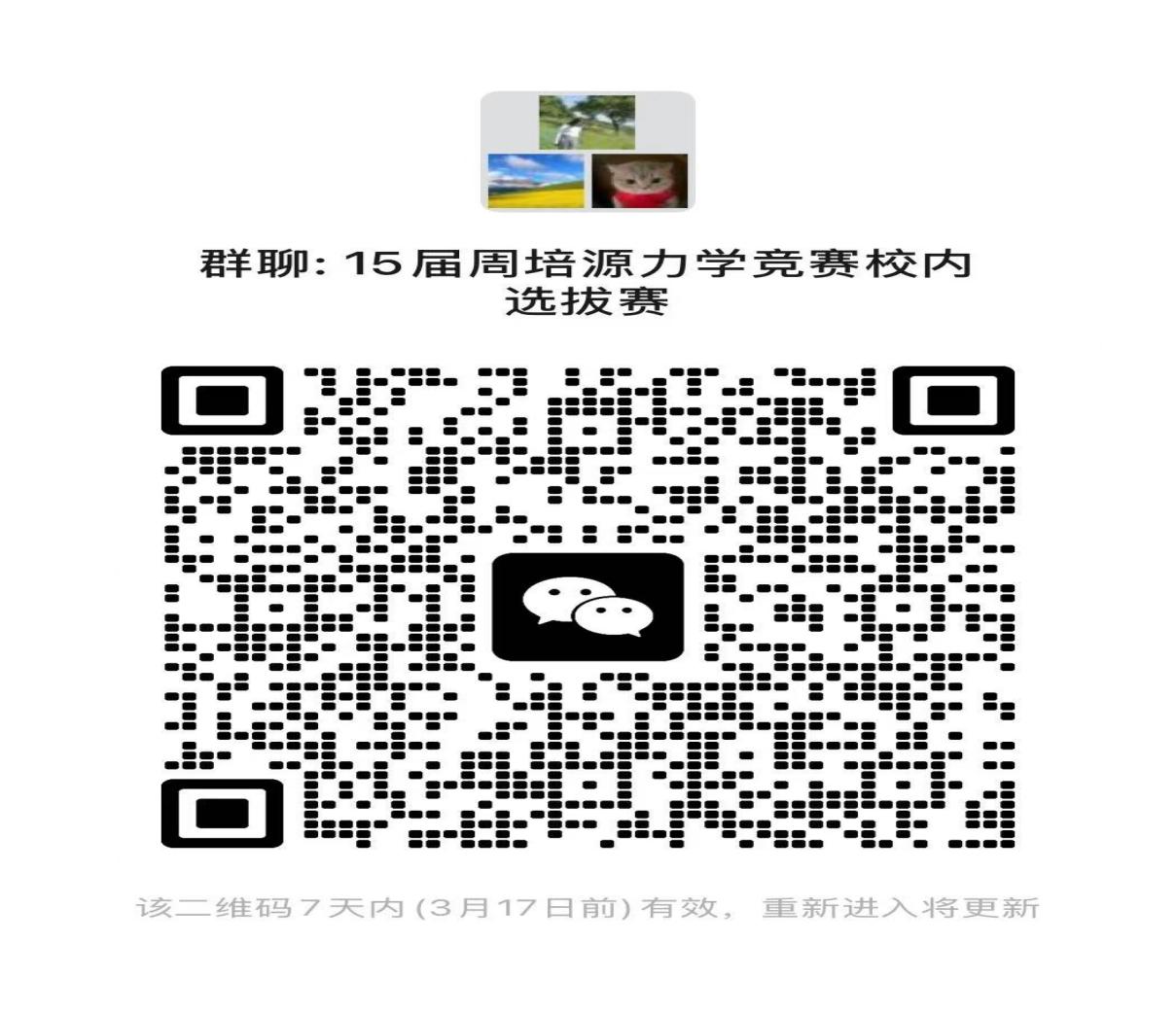 参赛者在报名时间内以“公司+姓名”为昵称,加入“第十五届周培源力学竞赛报名群”微信群。