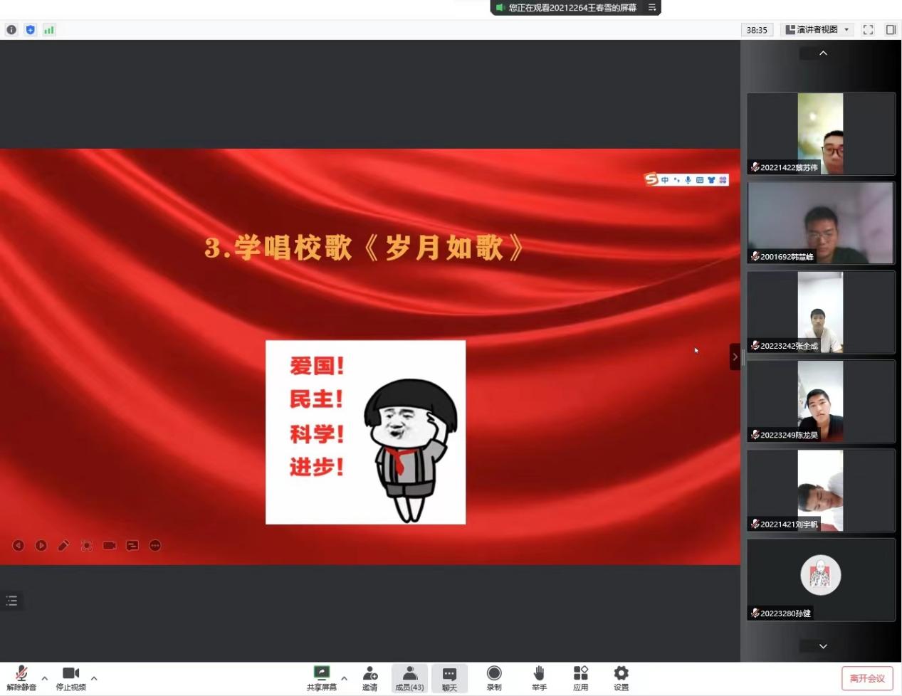 随后,各位新生助理班主任带领新生们学习Mksport体育校歌“岁月如歌”,新生们以饱满的热情投入到校歌学唱中,在学长学姐的带领下,整齐洪亮的歌声充满在会议室中。