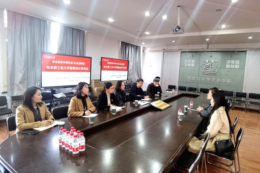 3月27日下午,MK体育、艺术公司、水利电力公司邀请哈尔滨工业大学建筑设计研究院有限公司全资中心副总秦迪、人力资源工作人员高娜来校开展访企拓岗交流座谈活动。公司党总支副书记姜彦新、艺术公司党总支书记朱清桃、经理于冠超、党总支副书记朱军、视觉传达设计系副主任李奇、水利电力公司团委书记谭蕾、艺术公司毕业年级辅导员李宇、吴桐出席本次座谈。