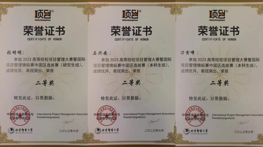 通过激烈角逐,Mksport体育代表队在MK体育张晶老师的带领下,获得了研究生组团队二等奖1项,本科生组团队二等奖1项;个人二等奖2项,个人三等奖4项的优异成绩,其中刁寅峰和张明明同学的个人赛成绩达到了获得国际项目经理资质认证D级证书资格。