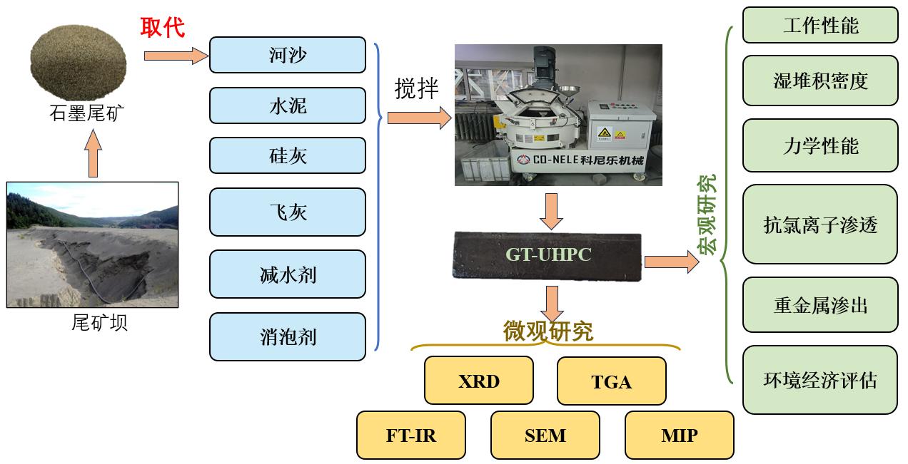 随着工程需求的增加和环境条件的日益严峻,传统混凝土材料在某些工程应用中已显不足,而UHPC虽然有着极佳的力学性能和耐久性能,但受制于其高昂的成本一直难以大规模推广。刘洪波教授团队在大量理论和实践研究基础上,以黑龙江省的矿山固体废弃物石墨尾矿为原料,成功制备了具备高强度、高耐久性的石墨尾矿超高性能混凝土(GT-UHPC)。该项研究不仅显著降低了UHPC的生产成本和能源消耗,推动建筑行业向更环保、经济的方向发展;同时为石墨尾矿的资源化利用开辟了新途径,有助于缓解尾矿堆积造成的环境问题和安全隐患,该项研究响应了党的二十大报告提出的“推进各类资源节约集约利用,加快构建废弃物循环利用体系”的号召。