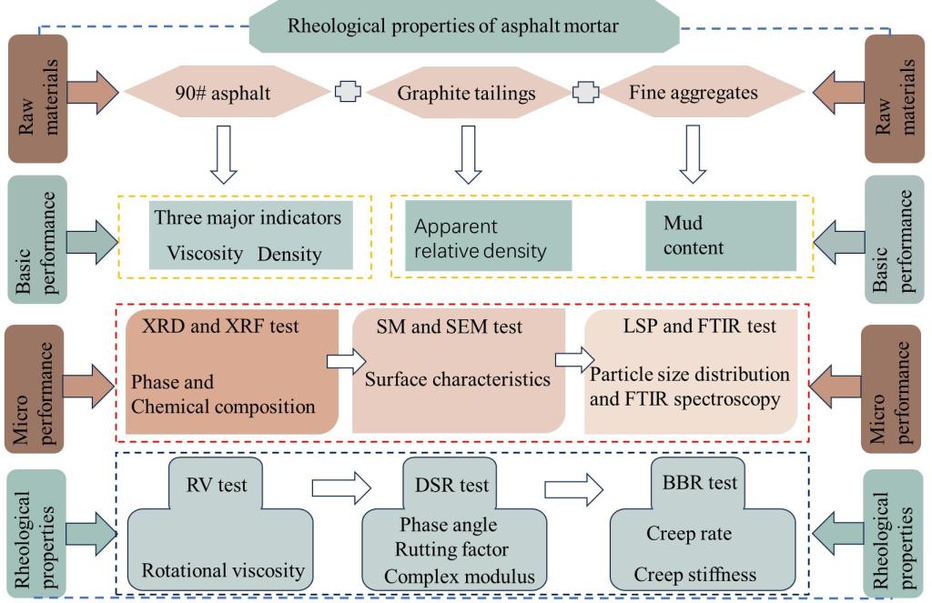 公路交通的发展加速了沥青混合料中大量天然材料的消耗,给自然界带来巨大的压力。沥青混合料作为路面材料中应用最广泛的材料,原材料面临着严峻的挑战,特别是沥青混合料的矿物骨料和填料,如石灰石、玄武岩、矿粉等。细集料作为沥青混合料的重要组成部分,占沥青混合料的35%~40%左右。因此,迫切需要在沥青混合料中找到既环保又经济的细集料替代材料。石墨矿的开采消耗了大量的自然资源,产生了大量的尾矿,增加了企业的经济和环保负担。缓解天然细集料的短缺,提高固体废物的综合利用,已成为热点和挑战性问题之一。刘洪波、高红帅团队在大量理论和实践研究基础上,以黑龙江省的矿山固体废弃物石墨尾矿为原料,成功制备了具备高粘度、高复合模量和高蠕变刚度的石墨尾矿沥青砂浆(GT mortar)。