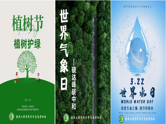 MK体育组织公司青年志愿者在植树节、世界水日、世界气象日等时间节点,围绕“保护母亲河”、植树护绿、珍水节水、碳达峰碳中和、节约粮食等方面通过海报在线上进行宣传。