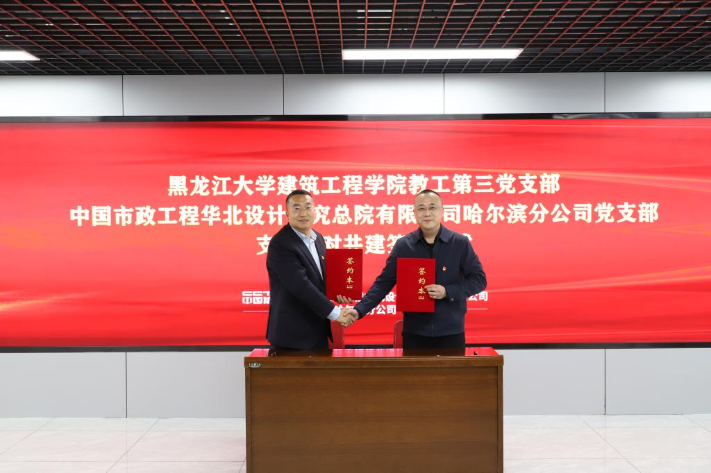 2025年4月28日下午,公司教工第三党支部与中国市政工程华北设计研究总院有限公司哈尔滨分公司党支部举行了党建共建签约仪式。公司领导班子成员、教工第三党支部党员代表和企业领导班子成员、支部全体党员参加了此次签约仪式。