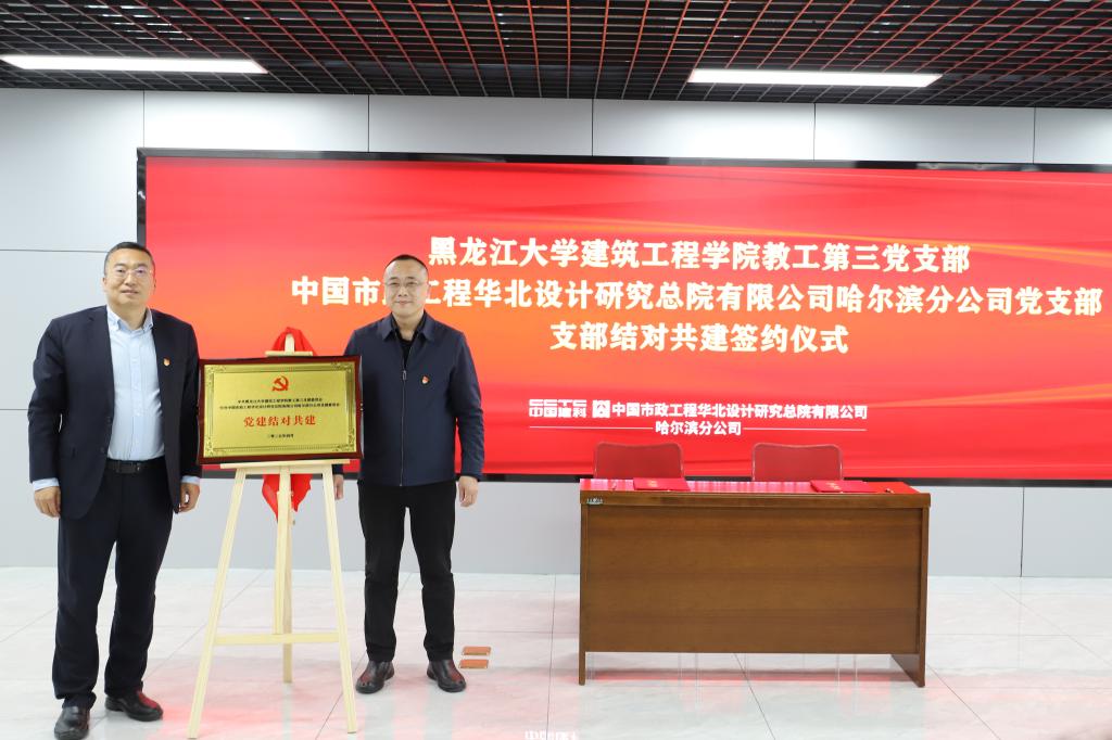 殷立辉、孟昭辉分别代表公司教工第三党支部和中国市政工程华北设计研究总院有限公司哈尔滨分公司党支部签署了《党支部结对共建协议书》,并为党支部结对共建揭牌,这也是第三党支部践行全国高校“双带头人”教师党支部书记“强国行”专项行动承诺的关键一步。